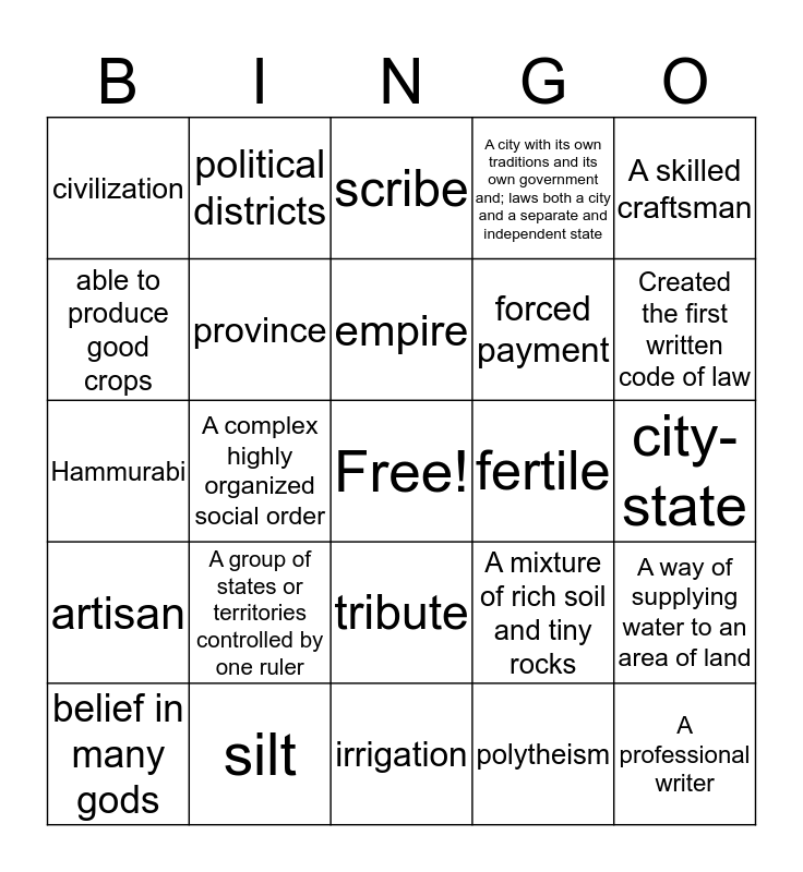 This bingo card has a free space and 24 words: A group of states or territories controlled by one ruler, silt, empire, belief in many gods, A skilled craftsman, civilization, able to produce good crops, political districts, fertile, tribute, forced payment, Hammurabi, A mixture of rich soil and tiny rocks, A way of supplying water to an area of land, province, polytheism, city-state, scribe, Created the first written code of law, A complex highly organized social order, A professional writer, artisan, A city with its own traditions and its own government and; laws both a city and a separate and independent state and irrigation.