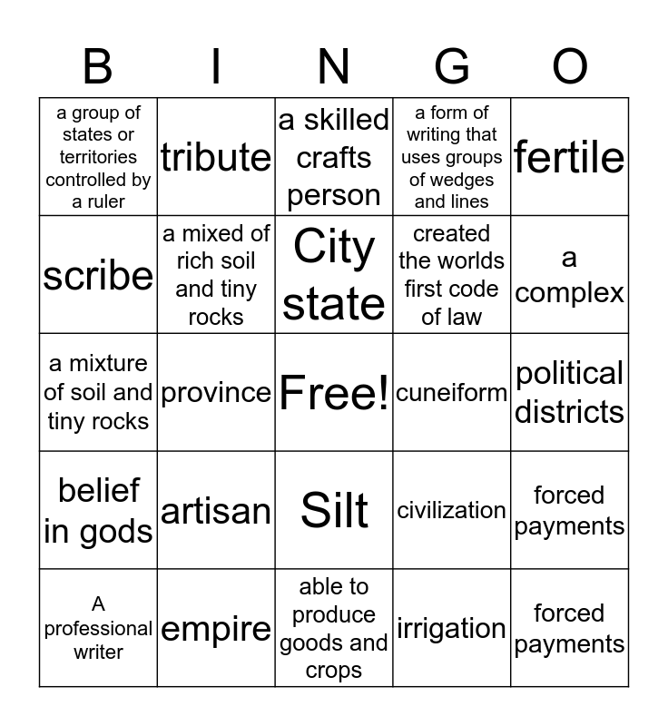 This bingo card has a free space and 24 words: A professional writer, artisan, City state, irrigation, fertile, a group of states or territories controlled by a ruler, tribute, a skilled crafts person, cuneiform, political districts, a mixture of soil and tiny rocks, a mixed of rich soil and tiny rocks, civilization, forced payments, scribe, empire, able to produce goods and crops, a form of writing that uses groups of wedges and lines, a complex, belief in gods, province, Silt, created the worlds first code of law and forced payments.