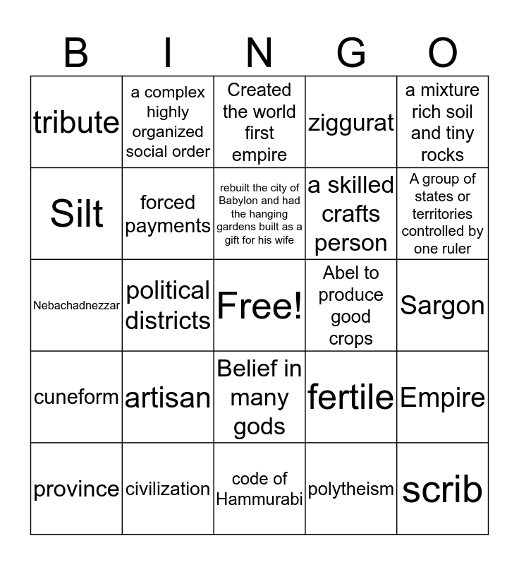 This bingo card has a free space and 24 words: artisan, civilization, rebuilt the city of Babylon and had the hanging gardens built as a gift for his wife, province, a mixture rich soil and tiny rocks, tribute, Silt, a complex highly organized social order, Abel to produce good crops, Belief in many gods, a skilled crafts person, Nebachadnezzar, fertile, Empire, forced payments, polytheism, Sargon, Created the world first empire, A group of states or territories controlled by one ruler, political districts, scrib, cuneform, ziggurat and code of Hammurabi.