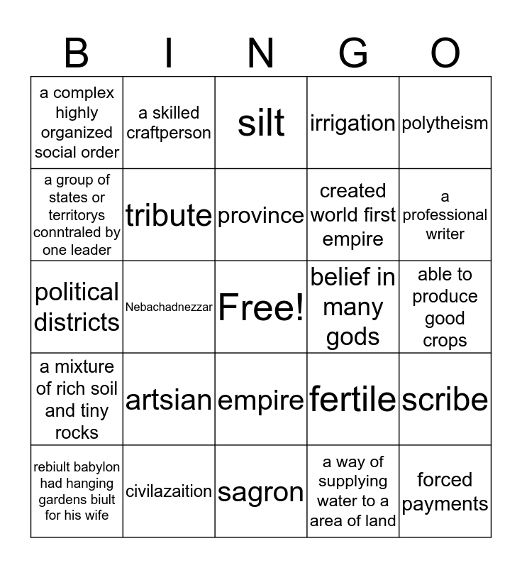 This bingo card has a free space and 24 words: artsian, civilazaition, province, rebiult babylon had hanging gardens biult for his wife, polytheism, a complex highly organized social order, a group of states or territorys conntraled by one leader, a skilled craftperson, belief in many gods, empire, created world first empire, political districts, fertile, scribe, tribute, a way of supplying water to a area of land, able to produce good crops, silt, a professional writer, Nebachadnezzar, forced payments, a mixture of rich soil and tiny rocks, irrigation and sagron.