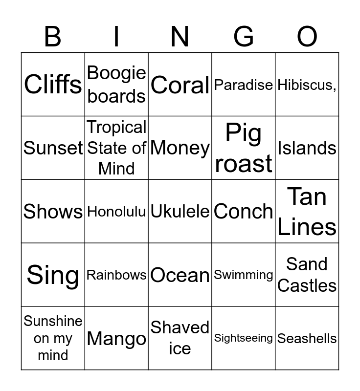 This bingo card has 106 words: Free!, Coconut, Hibiscus,, Lei,, Luau, Macadamia nut,, Mahi Mahi, Palm tree, Pineapple, Sun, Surfing, Volcano, Waves, Papaya, Lava, Sugar cane, Coral, Hawaii, Aloha, Beach, Ocean, Fish, Vacation, Surfboard, Hula, Rainbows, Islands, Paradise, Tourist, Snorkeling, Swimming, Sightseeing, Hiking, Reefs, Tsunami, Taro chips, Turtle, Dance, Money, Seaweed, Feast, Forbidden, Seashells, Sing, Mountains, Sunset, Sunrise, Cliffs, Rain, Ukulele, Plumeria, Mango, Resort,, Caribbean,, Vacation,, Gecko, Mongoose, Lighthouses, Waterfalls, Boogie boards, Humid, Salt water, Music, Hot, Airport, Passport, Temples, Fishing, Pig roast, Shows, Honolulu, Shaved ice, Sun screen, Grass skirt, Excursions, Dolphins, Scuba diving, Breeze, Cabana, Love, Towel, Massage, Couples, Relaxation, Meditation, Flamingo, Conch, Tango, Spider Monkey, Amazon, Sunglasses, Cocktail, Flip flops, Tiki torches, Umbrella, Sand Castles, Beach Volleyball, Swimming Suit, Beach Chair, Tan Lines, Tropical State of Mind, Salt in the air, sand in my hair, Sponge Bob, Beach Ball, Sunshine on my mind and I need some beach therapy.