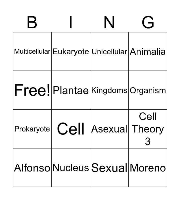 This bingo card has 16 words: Nucleus, Cell Theory 3, Unicellular, Multicellular, Prokaryote, Eukaryote, Asexual, Sexual, Free!, Plantae, Alfonso, Animalia, Cell, Organism, Kingdoms and Moreno.