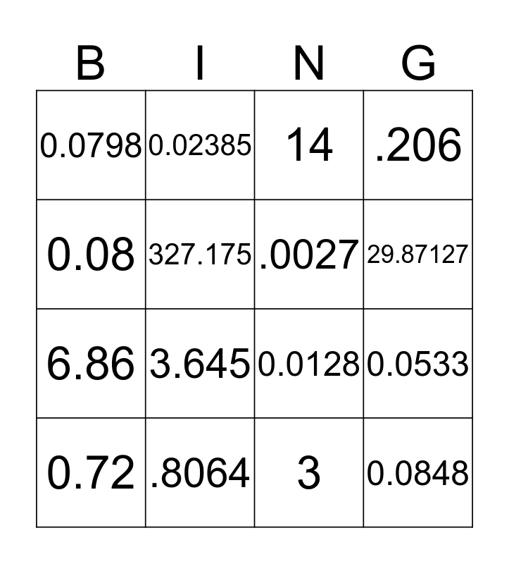 This bingo card has 16 words: 0.72, .8064, 14, .206, 0.08, 0.02385, 0.0128, 0.0533, 0.0798, 327.175, 3, 29.87127, 6.86, 3.645, .0027 and 0.0848.