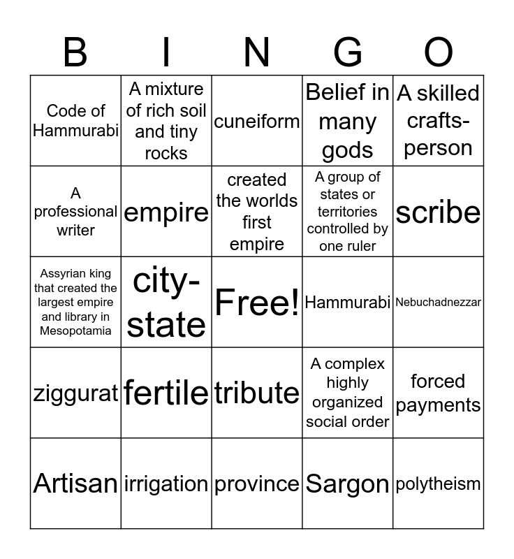 This bingo card has a free space and 29 words: Artisan, Ashurbanipal, city-state, civilization, Code of Hammurabi, cuneiform, empire, fertile, Hammurabi, irrigation, Nebuchadnezzar, polytheism, province, Sargon, scribe, silt, tribute, ziggurat, A skilled crafts-person, Assyrian king that created the largest empire and library in Mesopotamia, A complex highly organized social order, A form of writing that uses groups of lines and wedges, A group of states or territories controlled by one ruler, A professional writer, Belief in many gods, A mixture of rich soil and tiny rocks, forced payments, created the worlds first empire and able to produce good crops.