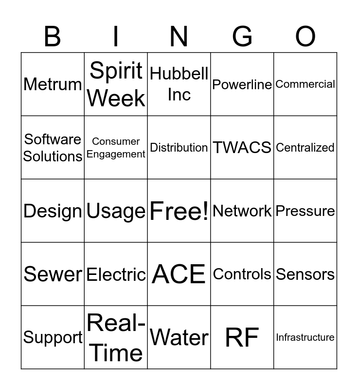 This bingo card has a free space and 52 words: Aclara Connect, Infrastructure, Gas, Water, Electric, Leadership, Spirit Week, Smart Meters, Software Solutions, Communication Network, Consumer Engagement, Implementation, Sensors, Controls, AMI, Energy, Distribution, Network, Residential, Commercial, Usage, RF, Metrum, TWACS, Synergize, Meter to Cash, Analytics, AclaraONE, Centralized, Cellular, Headend, Powerline, Innovation, SIS, HPS, Hubbell Inc, Real-Time, ZoneScan, Grid Monitoring, SSO, Detection, Pressure, Sewer, Customer Care, ACE, Combo, Utility, Design, Integrate, Deploy, Support and Innovation.