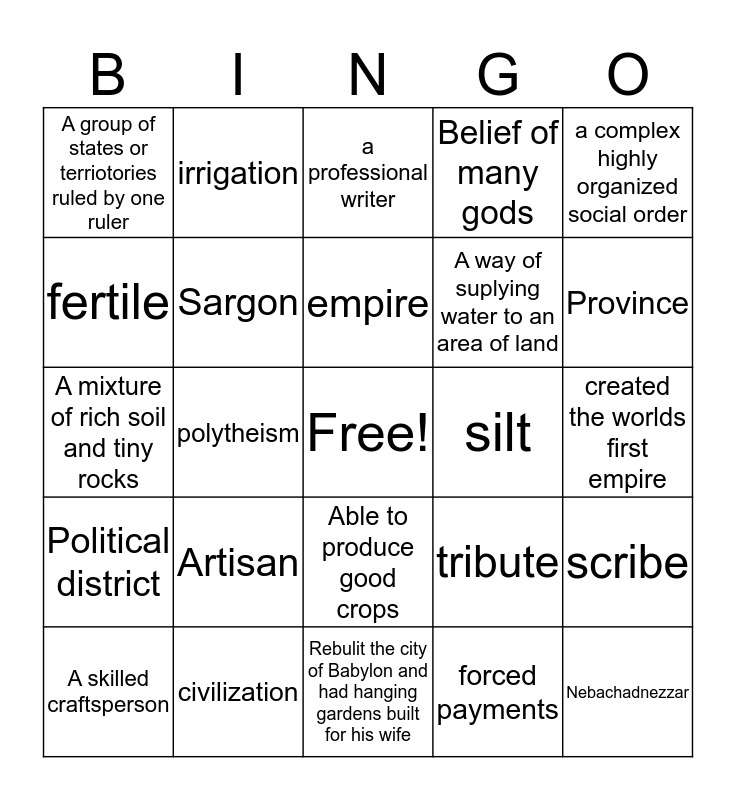 This bingo card has a free space and 24 words: Artisan, civilization, empire, A skilled craftsperson, a complex highly organized social order, A group of states or terriotories ruled by one ruler, fertile, irrigation, silt, Able to produce good crops, A way of suplying water to an area of land, A mixture of rich soil and tiny rocks, tribute, scribe, Sargon, forced payments, created the worlds first empire, a professional writer, Province, polytheism, Nebachadnezzar, Political district, Belief of many gods and Rebulit the city of Babylon and had hanging gardens built for his wife.