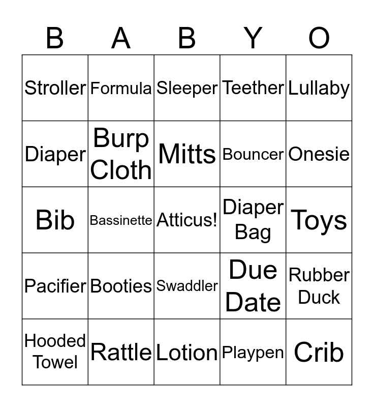This bingo card has a free space and 28 words: Rubber Duck, Bottle, Bouncer, Playpen, Diaper, Sleeper, Formula, Pacifier, Diaper Bag, Hooded Towel, Bib, Teether, Rattle, Lotion, Onesie, Powder, Booties, Burp Cloth, Mitts, Swaddler, Stroller, High Chair, Crib, Bassinette, Toys, Due Date, Lullaby and Boppy Pillow.