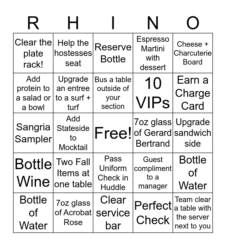 This bingo card has a free space and 24 words: Two Fall Items at one table, 7oz glass of Acrobat Rose, Bus a table outside of your section, Bottle of Water, Cheese + Charcuterie Board, Clear the plate rack!, Add protein to a salad or a bowl, Help the hostesses seat, 7oz glass of Gerard Bertrand, Pass Uniform Check in Huddle, 10 VIPs, Sangria Sampler, Guest compliment to a manager, Bottle of Water, Upgrade an entree to a surf + turf, Perfect Check, Upgrade sandwich side, Reserve Bottle, Earn a Charge Card, Add Stateside to Mocktail, Team clear a table with the server next to you, Bottle Wine, Espresso Martini with dessert and Clear service bar.