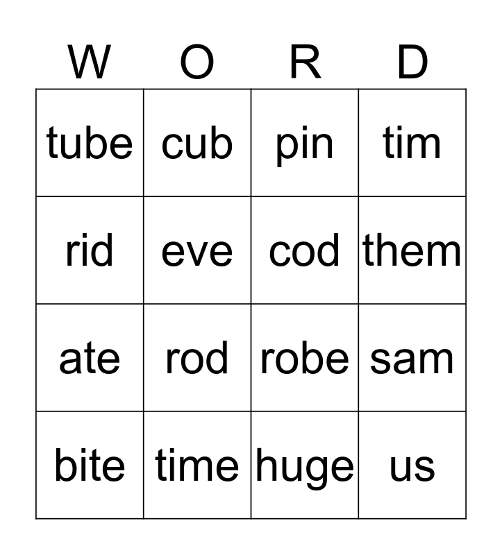 This bingo card has 45 words: bit, bite, kit, kite, hid, hide, pin, pine, rid, ride, tim, time, hop, hope, not, note, rob, robe, rode, rod, cub, cube, tub, tube, hug, huge, cut, cute, use, us, tap, tape, mad, made, same, sam, pet, pete, theme, them, eve, ate, at, cod and code.