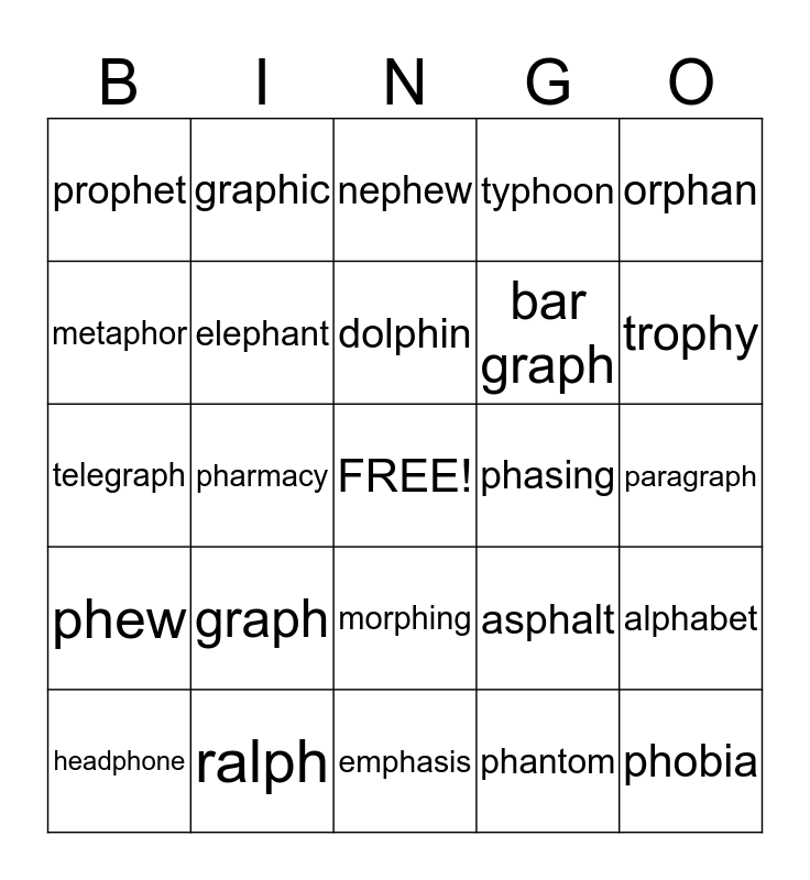 This bingo card has a free space and 24 words: graph, ralph, dolphin, headphone, orphan, prophet, metaphor, graphic, phasing, morphing, bar graph, telegraph, asphalt, alphabet, elephant, phantom, paragraph, nephew, trophy, pharmacy, phobia, phew, typhoon and emphasis.