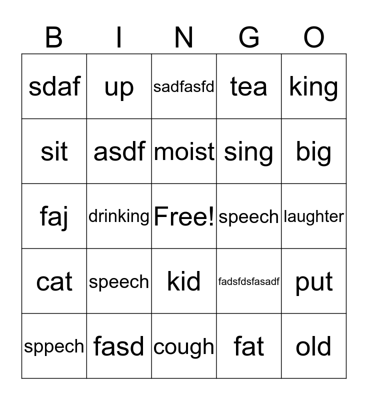 This bingo card has a free space and 29 words: sppech, swallowing, drinking, eatingn, sdaf, sadfasfd, asdf, speech, speech, fasd, laughter, old, cough, fat, big, small, kid, cat, king, faj, fadsfdsfasadf, paul, sing, sit, tea, up, put, moist and noise.