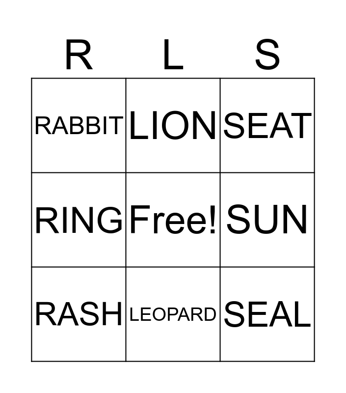 This bingo card has a free space and 14 words: RAT, LOCK, SUN, RABBIT, SEAT, RING, LOBSTER, SOCK, RATTLE, LION, SEAL, RASH, LEOPARD and SANTA.