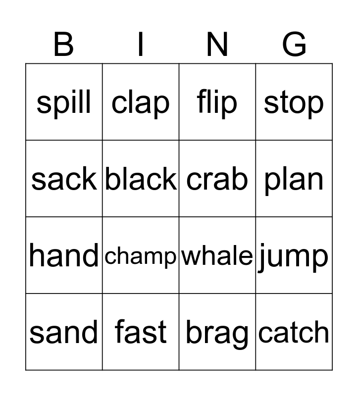 This bingo card has 20 words: jump, snack, flip, gift, sand, sack, fast, spill, hand, clap, champ, whale, black, catch, crab, grab, plan, stop, brag and swim.