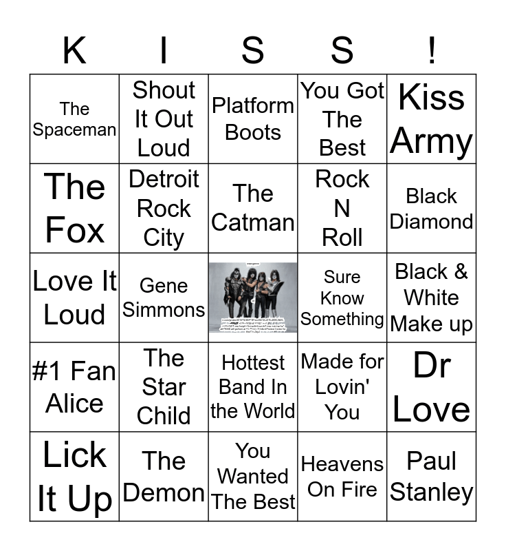 This bingo card has a free space and 24 words: The Star Child, The Demon, The Catman, Lick It Up, Kiss Army, The Spaceman, The Fox, Shout It Out Loud, Sure Know Something, Hottest Band In the World, Rock N Roll, Love It Loud, Made for Lovin' You, Dr Love, Detroit Rock City, Heavens On Fire, Black & White Make up, Platform Boots, Black Diamond, Gene Simmons, Paul Stanley, #1 Fan Alice, You Got The Best and You Wanted The Best.