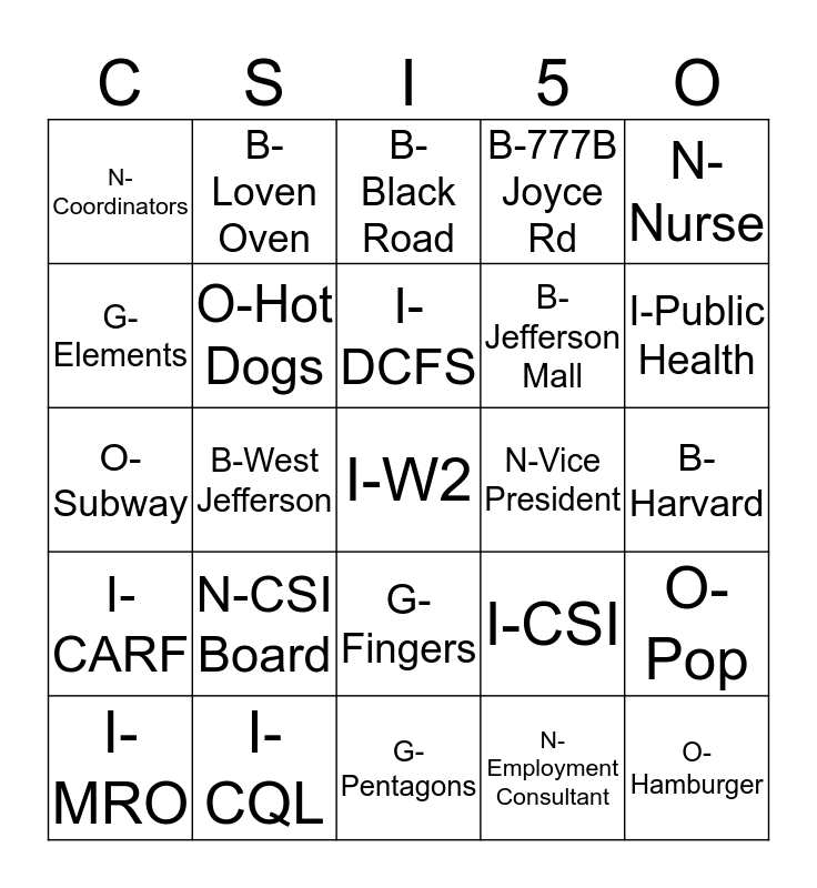 This bingo card has 70 words: B-Joyce Rd, B-West Jefferson, B-Van Buren, B-Oneida, B-Harvard, B-611 Cass Street, B-Loven Oven, B-2500 Crystal, B-Jefferson Mall, B-Thompson School, B-415 Cass Street, B-407 Center, B-Black Road, B-777B Joyce Rd, B-781 Joyce, I-CARF, I-CQL, I-DCFS, I-CILA, I-Public Health, I-MRO, I-CEU's, I-W2, I-CSI, I-HQS, I-CDP, I-MHA, N-CEO, N-Vice President, N-Directors, N-Coordinators, N-Case Managers, N-Maintenance, N-DSP, N-Career Counselor, N-Production Staff, N-Mental Health Worker, N-Coach, N-Employment Consultant, N-Nurse, N-Secretary, N-CSI Board, G-Fingers, G-Toes, G-Alive, G-Elements, G-Senses, G-Years, G-Pillars, G-Olympic Flag, G-Starfish, G-The Perfect Fifth, G-Pentagons, G-Dollars, O-Pop, O-Pizza, O-Hot Dogs, O-Tacos, O-Candy Bar, O-Hamburger, O-Subway, O-McDonald's, O-Cereal, O-Cookies, O-Chips, O-French Fries, O-Pancakes, O-Cupcakes, O-Pasta and O-Meatballs.