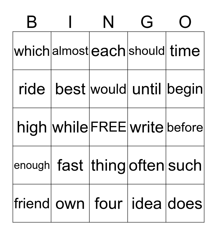 This bingo card has a free space and 24 words: fast, own, would, friend, time, which, ride, almost, write, thing, until, high, often, such, best, idea, before, each, begin, while, does, enough, should and four.