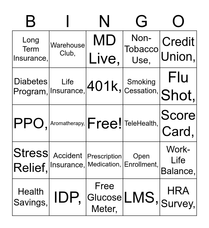 This bingo card has a free space and 39 words: Medical Carrier, Wellness, Life Insurance, Health Savings, Prescription Medication, 401k, 457b, Credit Union, Stress Relief, Aromatherapy, Non-Tobacco Use, HRA Survey, Score Card, TeleHealth, Accident Insurance, Short Term Insurance, Long Term In, Medical Carrier, Wellness,, Life Insurance,, Health Savings,, Prescription Medication,, 401k,, 457b,, Credit Union,, Stress Relief,, Aromatherapy,, Non-Tobacco Use,, HRA Survey,, Score Card,, TeleHealth,, Accident Insurance,, Short Term Insurance,, Long Term Insurance,, Cancer Insurance,, Open Enrollment,, Diabetes Program,, Free Glucose Meter,, Smoking Cessation,, Flu Shot,, Back Pain,, Neck Pain,, Meditation,, Weekly Weigh-Ins,, Yoga, Warehouse Club,, Financial Wellness,, 90-Day Supply,, MD Live,, IDP,, LMS,, Tuition Reimbursement,, Work-Life Balance,, PPO, and HDHP,.