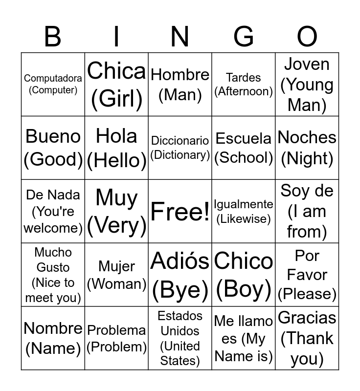 This bingo card has a free space and 24 words: Mujer (Woman), Problema (Problem), Diccionario (Dictionary), Nombre (Name), Joven (Young Man), Computadora (Computer), Bueno (Good), Chica (Girl), Igualmente (Likewise), Adiós (Bye), Escuela (School), De Nada (You're welcome), Chico (Boy), Por Favor (Please), Hola (Hello), Me llamo es (My Name is), Soy de (I am from), Hombre (Man), Noches (Night), Muy (Very), Gracias (Thank you), Mucho Gusto (Nice to meet you), Tardes (Afternoon) and Estados Unidos (United States).