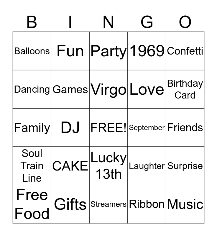 This bingo card has a free space and 24 words: CAKE, Gifts, Virgo, Free Food, Confetti, Balloons, Dancing, Fun, September, Lucky 13th, Love, Family, Laughter, Surprise, Games, Ribbon, Friends, Party, Birthday Card, DJ, Music, Soul Train Line, 1969 and Streamers.