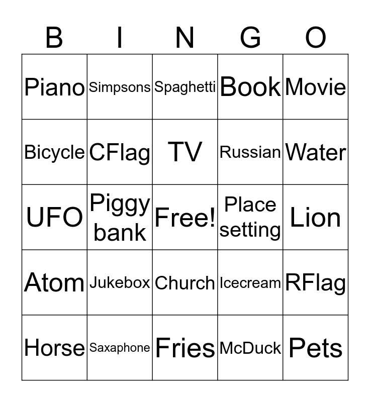 This bingo card has a free space and 40 words: Storm, UFO, Telephone, CFlag, Saxaphone, Church, TV, Paint tube, Movie, Atom, Piggy bank, Book, Pets, Lion, Place setting, Jukebox, Keys & Car, Piano, Apple pie, Spaghetti, RFlag, McDuck, Russian, Bicycle, Man & stroller, Groceries, Package, Math, Hammer & Nails, House, Pharmacy, Horse, Fish, Icecream, Water, Fries, GFlag, Baby, Simpsons and German.