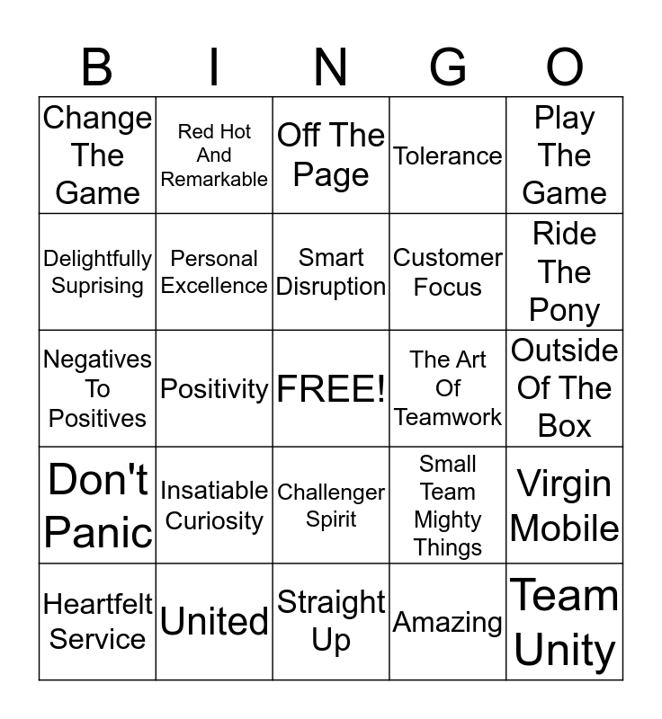 This bingo card has a free space and 25 words: Insatiable Curiosity, Straight Up, Smart Disruption, Heartfelt Service, Play The Game, Change The Game, Delightfully Suprising, Red Hot And Remarkable, The Art Of Teamwork, Challenger Spirit, Customer Focus, Negatives To Positives, Small Team Mighty Things, Virgin Mobile, Personal Excellence, Virgin Values, Outside Of The Box, Off The Page, Ride The Pony, Positivity, Team Unity, United, Don't Panic, Tolerance and Amazing.