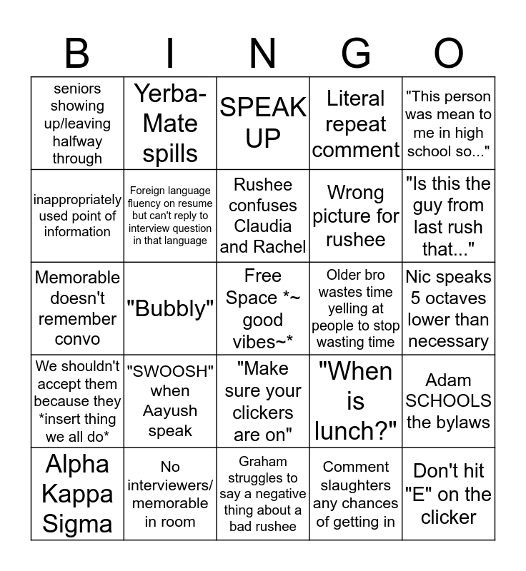 This bingo card has a free space and 24 words: "SWOOSH" when Aayush speak, No interviewers/ memorable in room, Rushee confuses Claudia and Rachel, Alpha Kappa Sigma, "This person was mean to me in high school so...", seniors showing up/leaving halfway through, inappropriately used point of information, Yerba-Mate spills, Older bro wastes time yelling at people to stop wasting time, "Make sure your clickers are on", Wrong picture for rushee, Memorable doesn't remember convo, "When is lunch?", Adam SCHOOLS the bylaws, Foreign language fluency on resume but can't reply to interview question in that language, Comment slaughters any chances of getting in, Nic speaks 5 octaves lower than necessary, SPEAK UP, "Is this the guy from last rush that...", "Bubbly", Don't hit "E" on the clicker, We shouldn't accept them because they *insert thing we all do*, Literal repeat comment and Graham struggles to say a negative thing about a bad rushee.