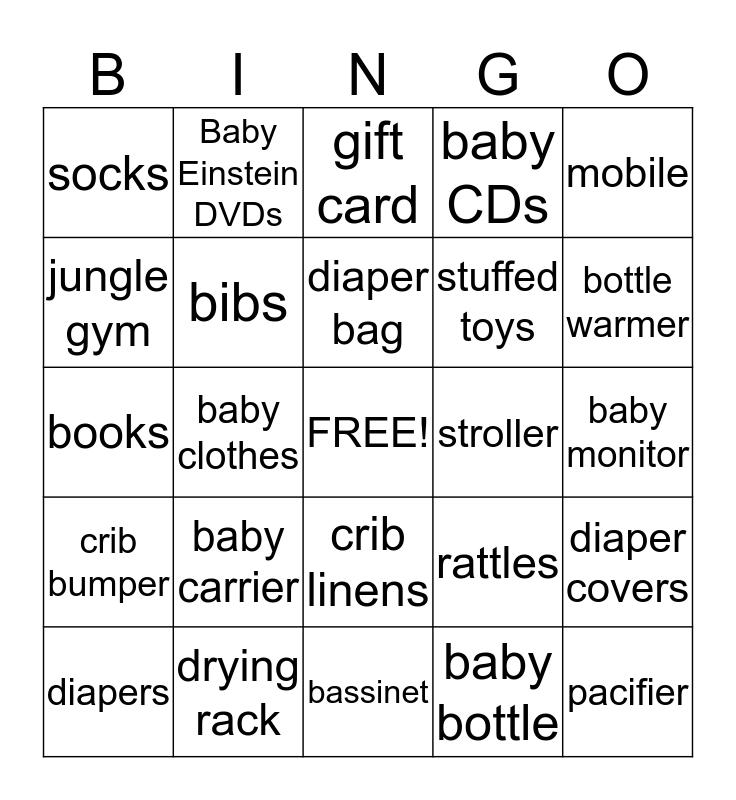 This bingo card has a free space and 29 words: diapers, wipes, baby clothes, mittens, socks, gift card, bibs, baby carrier, stroller, drying rack, baby monitor, pacifier, bassinet, baby bottle, bottle warmer, burp cloth, crib linens, crib bumper, mobile, books, rattles, teething rings, stuffed toys, jungle gym, baby CDs, Baby Einstein DVDs, diaper covers, diaper bag and nursery play yard.
