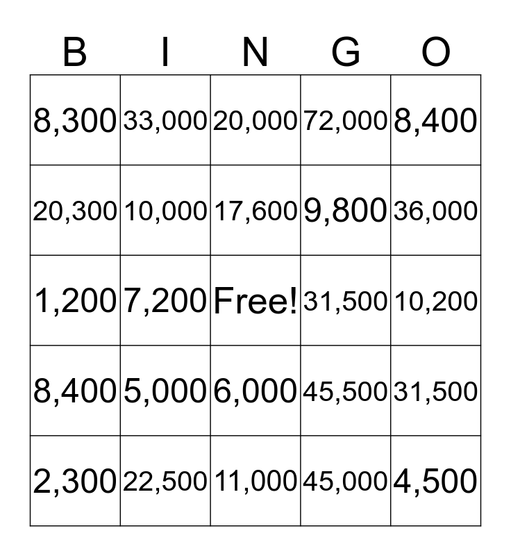 This bingo card has a free space and 24 words: 5,000, 22,500, 17,600, 2,300, 8,400, 8,300, 20,300, 33,000, 31,500, 6,000, 9,800, 1,200, 45,500, 31,500, 10,000, 45,000, 10,200, 20,000, 36,000, 7,200, 4,500, 8,400, 72,000 and 11,000.