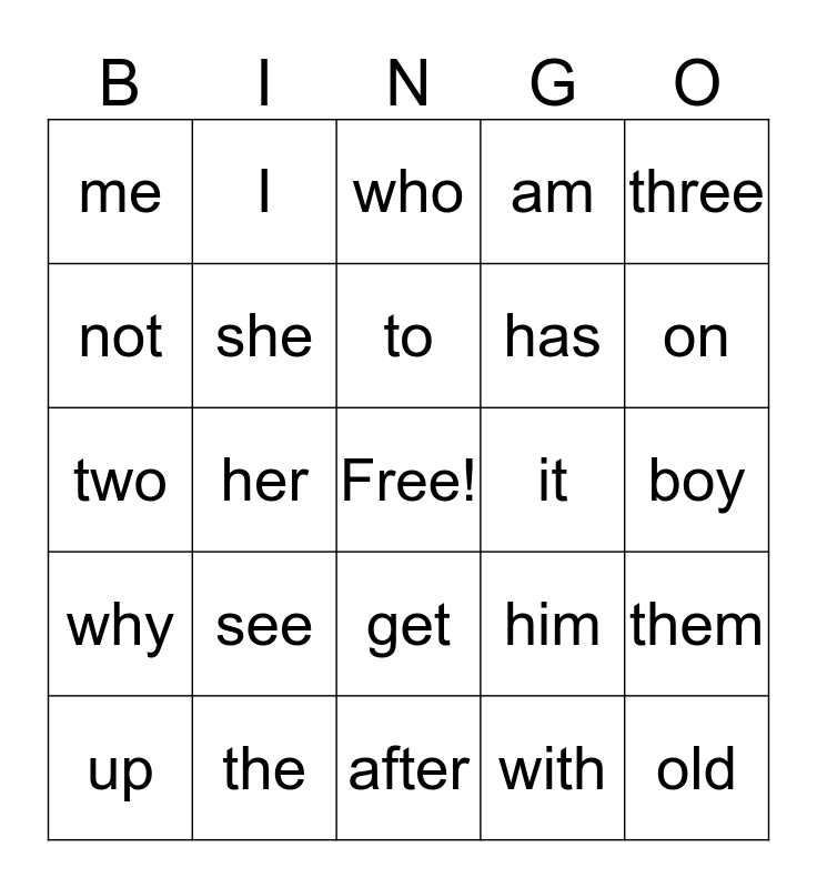 This bingo card has a free space and 24 words: see, the, to, up, three, me, not, I, it, get, has, two, him, them, she, with, boy, who, on, her, old, why, am and after.