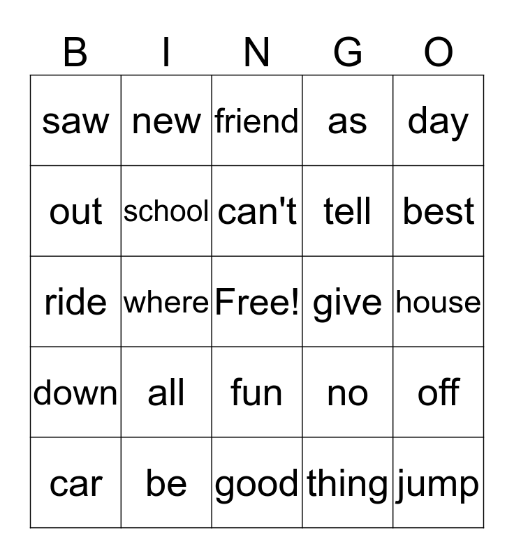 This bingo card has a free space and 24 words: all, be, can't, car, day, saw, out, new, give, fun, tell, ride, no, off, school, thing, house, friend, best, where, jump, down, as and good.
