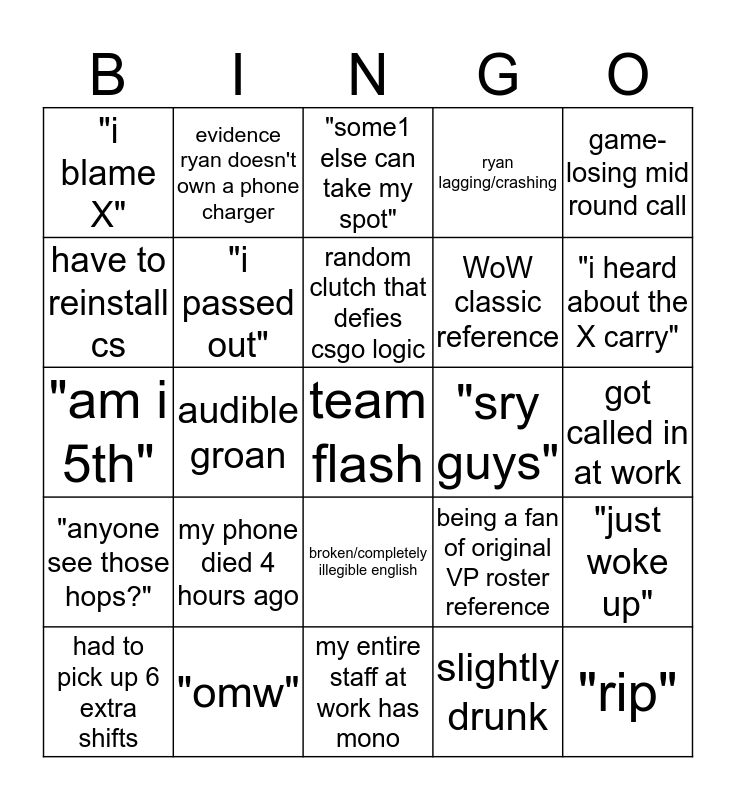 This bingo card has a free space and 24 words: my phone died 4 hours ago, "omw", random clutch that defies csgo logic, had to pick up 6 extra shifts, game-losing mid round call, "i blame X", have to reinstall cs, evidence ryan doesn't own a phone charger, "sry guys", broken/completely illegible english, WoW classic reference, "am i 5th", being a fan of original VP roster reference, "just woke up", "i passed out", slightly drunk, got called in at work, "some1 else can take my spot", "i heard about the X carry", audible groan, "rip", "anyone see those hops?", ryan lagging/crashing and my entire staff at work has mono.