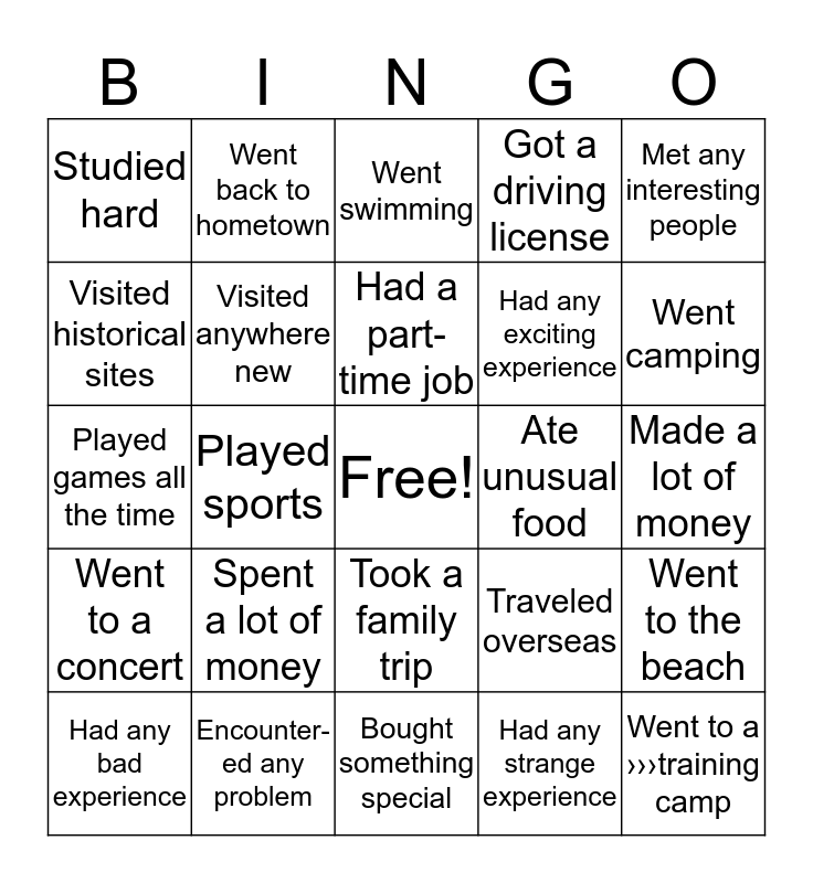 This bingo card has a free space and 24 words: Spent a lot of money, Encounter-ed any problem, Had a part-time job, Had any bad experience, Met any interesting people, Studied hard, Visited historical sites, Went back to hometown, Ate unusual food, Took a family trip, Had any exciting experience, Played games all the time, Traveled overseas, Went to the beach, Visited anywhere new, Had any strange experience, Made a lot of money, Went swimming, Went camping, Played sports, Went to a ›››training camp, Went to a concert, Got a driving license and Bought something special.