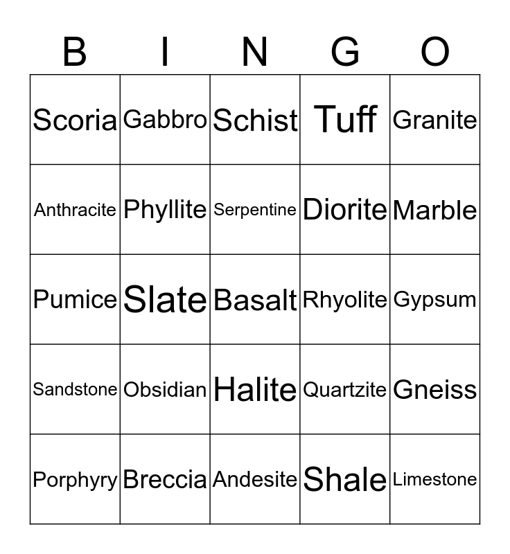 This bingo card has a free space and 24 words: Obsidian, Breccia, Serpentine, Porphyry, Granite, Scoria, Anthracite, Gabbro, Rhyolite, Halite, Diorite, Pumice, Quartzite, Gneiss, Phyllite, Shale, Gypsum, Schist, Marble, Slate, Limestone, Sandstone, Tuff and Andesite.