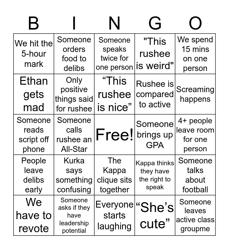 This bingo card has a free space and 24 words: Kurka says something confusing, Someone asks if they have leadership potential, “This rushee is nice”, We have to revote, We spend 15 mins on one person, We hit the 5-hour mark, Ethan gets mad, Someone orders food to delibs, Someone brings up GPA, The Kappa clique sits together, Rushee is compared to active, Someone reads script off phone, Kappa thinks they have the right to speak, Someone talks about football, Only positive things said for rushee, “She’s cute”, 4+ people leave room for one person, Someone speaks twice for one person, Screaming happens, Someone calls rushee an All-Star, Someone leaves active class groupme, People leave delibs early, "This rushee is weird" and Everyone starts laughing.