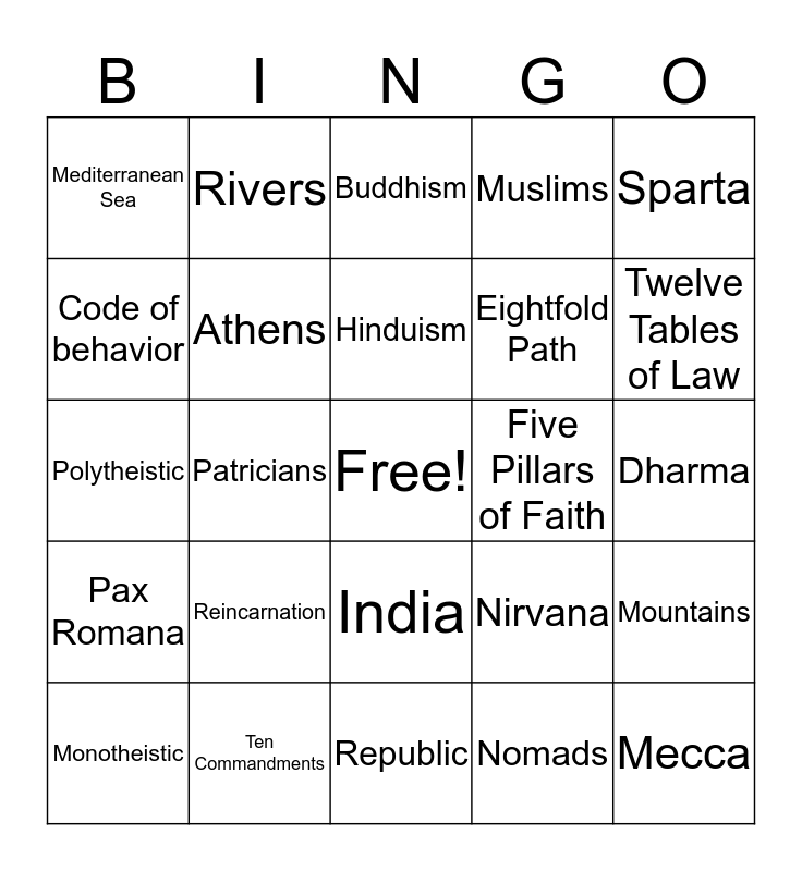This bingo card has a free space and 32 words: Nomads, Code of Hammurabi, Patricians, Plebeians, Pax Romana, Athens, Sparta, Mountains, Rivers, Fall of the Roman Empire, Hinduism, Buddhism, Islam, Allah, Five Pillars of Faith, Four Noble Truths, Monotheistic, Polytheistic, India, Reincarnation, Nirvana, Karma, Dharma, Ten Commandments, Mecca, Muslims, Eightfold Path, Code of behavior, Mediterranean Sea, Republic, Cultural diffusion and Twelve Tables of Law.