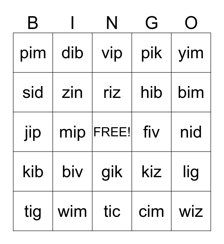 This bingo card has a free space and 24 words: biv, wim, riz, tig, yim, pim, sid, dib, fiv, gik, hib, jip, kiz, lig, zin, cim, nid, vip, bim, mip, wiz, kib, pik and tic.