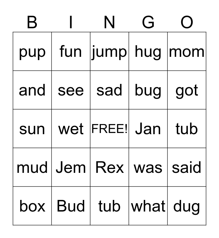 This bingo card has a free space and 24 words: Jem, Bud, sad, box, mom, pup, and, fun, Jan, Rex, bug, sun, was, said, see, what, tub, jump, got, wet, dug, mud, hug and tub.