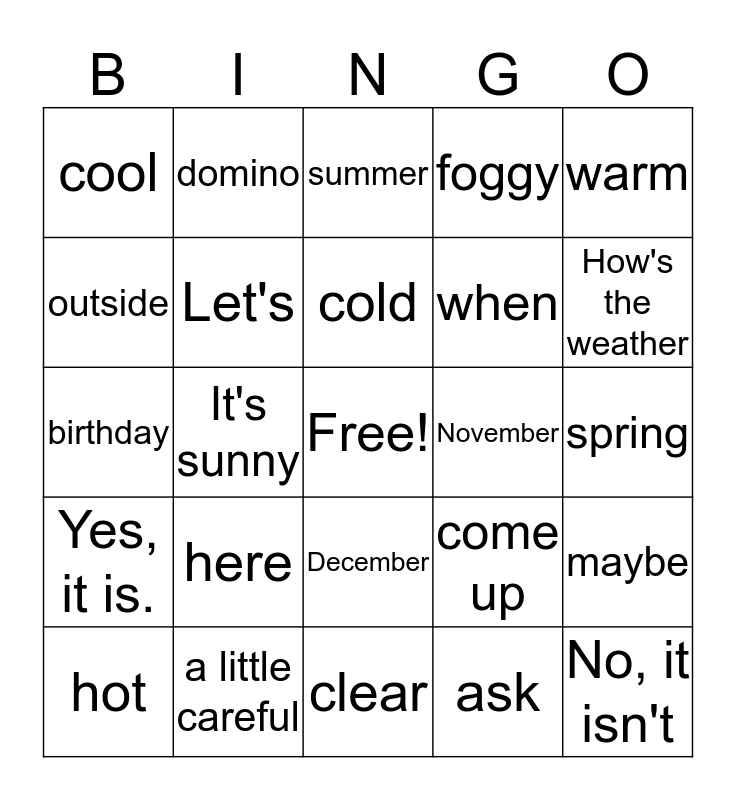 This bingo card has a free space and 24 words: here, a little careful, cold, hot, warm, cool, outside, domino, November, December, when, birthday, come up, maybe, Let's, ask, spring, summer, How's the weather, It's sunny, No, it isn't, Yes, it is., foggy and clear.