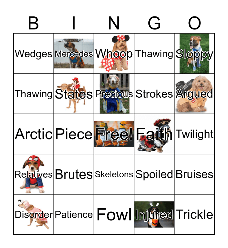 This bingo card has 15 images, a free space and 34 words: Wretched, Injured, Tottered, Rushed, Relatives, States, Sloppy, Disorder, Mercedes, Fluttered, Precious, Whoop, Citizens, Weary, Faith, Argued, Patience, Arctic, Brutes, Spoiled, Skeletons, Awaited, Wedges, Twilight, Fowl, Trickle, Thawing, Alaska, Strokes, Thawing, Knelt, Piece, Bruises and Crawl.