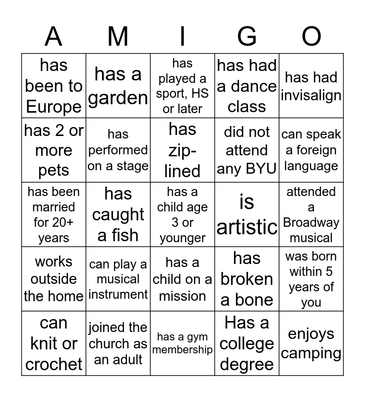 This bingo card has 25 words: can play a musical instrument, has a gym membership, has zip-lined, can knit or crochet, has had invisalign, has been to Europe, has 2 or more pets, has a garden, is artistic, has a child on a mission, did not attend any BYU, has been married for 20+ years, has broken a bone, was born within 5 years of you, has performed on a stage, enjoys camping, attended a Broadway musical, has played a sport, HS or later, can speak a foreign language, has caught a fish, has a child age 3 or younger, joined the church as an adult, works outside the home, has had a dance class and Has a college degree.