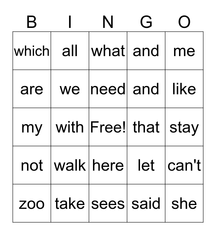 This bingo card has a free space and 29 words: zoo, yes, with, will, which, what, we, walk, that, take, stay, she, sees, said, like, can, here, not, me, my, let, help, and, are, and, all, can't, need and to.