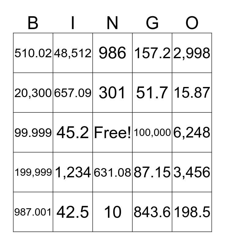This bingo card has a free space and 24 words: 1,234, 42.5, 301, 987.001, 2,998, 510.02, 20,300, 48,512, 100,000, 631.08, 51.7, 99.999, 87.15, 3,456, 657.09, 843.6, 6,248, 986, 15.87, 45.2, 198.5, 199,999, 157.2 and 10.