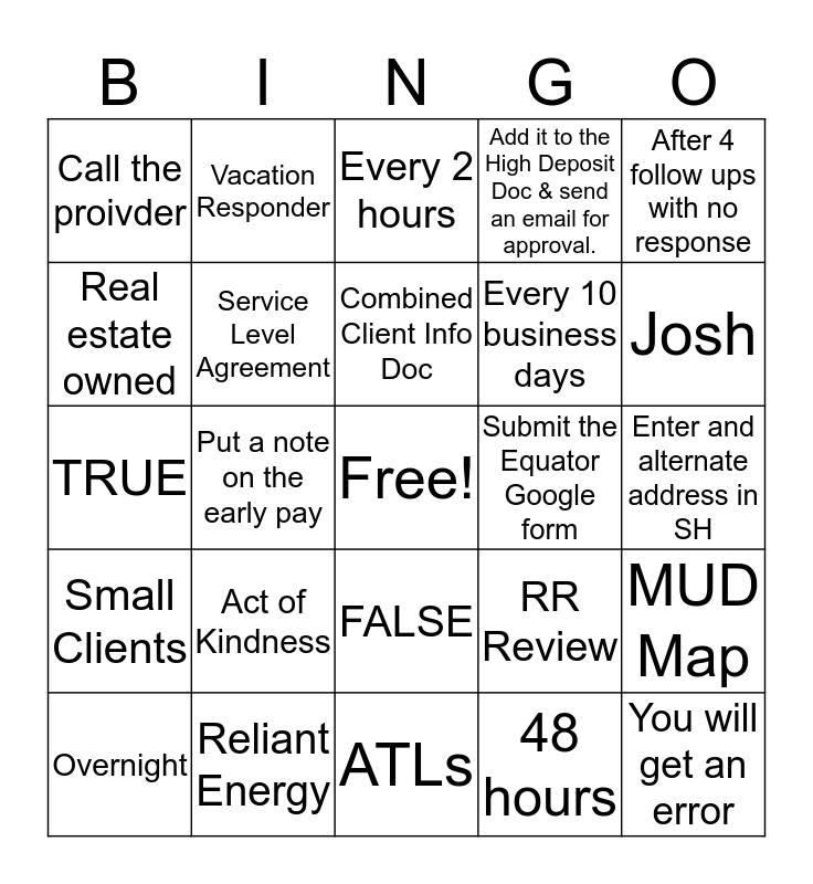 This bingo card has a free space and 29 words: Overnight, Client Inspection, Put a note on the early pay, Broker Action Requested, Call the proivder, Every 2 hours, Service Level Agreement, Act of Kindness, Submit the Equator Google form, Reliant Energy, Enter and alternate address in SH, You will get an error, ATLs, 48 hours, Josh, Weekly, FALSE, Small Clients, After 4 follow ups with no response, TRUE, RR Review, PMC SFR Holding LLC, Every 10 business days, Real estate owned, Add it to the High Deposit Doc & send an email for approval., Vacation Responder, MUD Map, Combined Client Info Doc and Urgent.