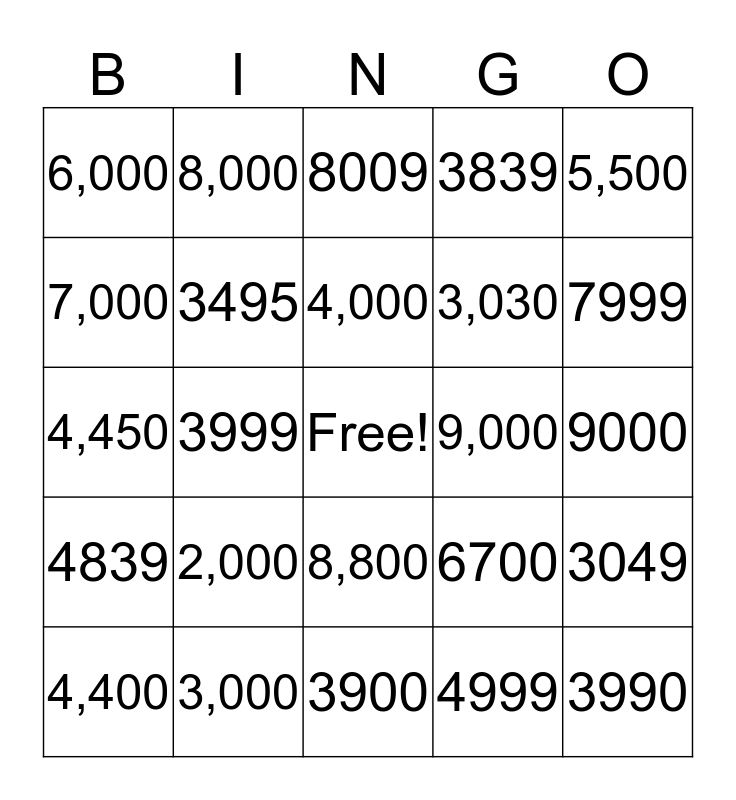 This bingo card has a free space and 24 words: 2,000, 3,000, 4,000, 4,400, 5,500, 6,000, 7,000, 8,000, 9,000, 8,800, 3,030, 4,450, 6700, 3049, 3495, 4999, 9000, 8009, 7999, 3999, 3990, 4839, 3839 and 3900.