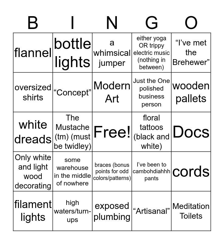 This bingo card has a free space and 37 words: thin rimmed spectacles, no more than 5 women, mustard yellow beanie (ill fitting), “Concept”, cords, some warehouse in the middle of nowhere, Modern Art, dungarees, “I’ve met the Brehewer”, token old dude, The Mustache (tm) (must be twidley), either yoga OR trippy electric music (nothing in between), Meditation Toilets, Docs, oversized shirts, Only white and light wood decorating, shitty tables, a whimsical jumper, braces (bonus points for odd colors/patterns), floral tattoos (black and white), flannel, wooden pallets, filament lights, exposed plumbing, double denim, “Artisanal”, bottle lights, plant pot ash trays, communal seating, man bun, a Succulent (tm), high waters/turn-ups, white dreads, terf bangs, I’ve been to cambohdiahhh pants, Just the One polished business person and “Purveyor(s)”.