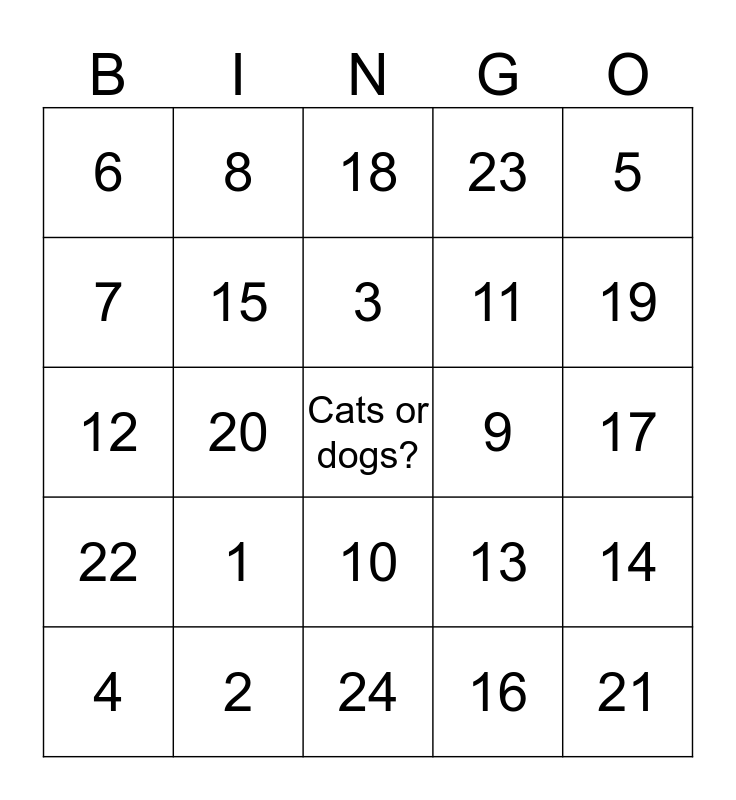 This bingo card has a free space and 24 words: 1, 2, 3, 4, 5, 6, 7, 8, 9, 10, 11, 12, 13, 14, 15, 16, 17, 18, 19, 20, 21, 22, 23 and 24.