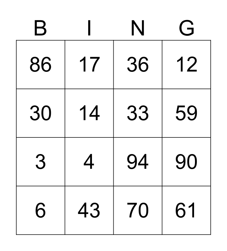 This bingo card has 28 words: 15, 87, 3, 29, 14, 36, 17, 61, 43, 21, 94, 12, 75, 11, 4, 100, 67, 33, 59, 72, 86, 13, 6, 90, 70, 19, 30 and 27.