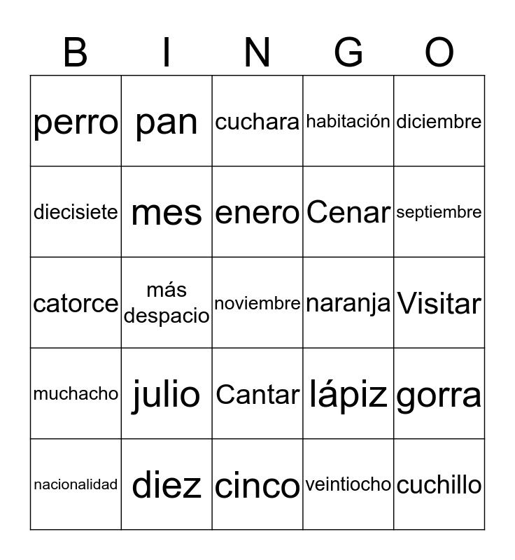 This bingo card has 145 words: Free!, hola, buenos dias, Me llamo, mucho gusto, lápiz, reloj, borrador, cuaderno, libro, papel, escritorio, regla, caja de lápices, puerta, pizarra, ventana, luz, mochila, pared, professor, gorra, basura, silla, señor, más despacio, pan, Hablar, viajar, buscar, Esperar, Ayudar, Comprar, Visitar, Preguntar, Contestar, Mirar, Bailar, Cenar, Estudiar, Escuchar, Trabajar, Cantar, Explicar, Caminar, nadar, apellido, Buenos noches, Buenos tardes, ser, estar, canadiense, nacionalidad, idioma, nombre, país, señora, planta, zapato, copa, cuchara, cuchillo, tenedor, mesa, sombrero, naranja, muchacho, muchacha, manzana, maleta, piña, escuela, perro, gato, huevo, caballo, helado, efectivo, calle, habitación, dirección, codigo postal, llave, tarjeta, fecha de nacimiento, uno, dos, tres, cuatro, cinco, seis, siete, ocho, nueve, diez, once, doce, trece, catorce, quince, dieciseis, diecisiete, dieciocho, diecinueve, veinte, enero, febrero, marzo, abril, mayo, junio, julio, agosto, septiembre, octubre, noviembre, diciembre, veintiuno, veintidos, veintitres, veinticuatro, veinticinco, veintiseis, veintiseiete, veintiocho, veintinueve, trenta, trenta y uno, primero, segundo, tercer, Lunes, Martes, Miércoles, Jueves, Viernes, Sabado, Domingo, día de la semana, número, mes, tiempo, mañana, adios and cuidate.