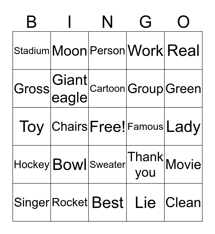This bingo card has a free space and 60 words: Interview, Rocket, Indians, Hockey, Lie, Tease, Giant eagle, Team, Group, Class, Work, California, Gross, Ignore, Fart, Stadium, Clean, Real, Made up, Cartoon, Famous, Person, Singer, Movie, Actor, Princess, Past, Great, Green, Room, Telephone, Balloon, Picture, Cow, Moon, Bears, Sitting, Chairs, Mittens, Toy, Mouse, Bowl, Lady, Whispering, Thank you, Carrots, Apples, Sweet, Eat, Sweater, Best, Choose, Rabbits, Lambs, Friends, Play, Fun, Share, Blessings and Prayers.