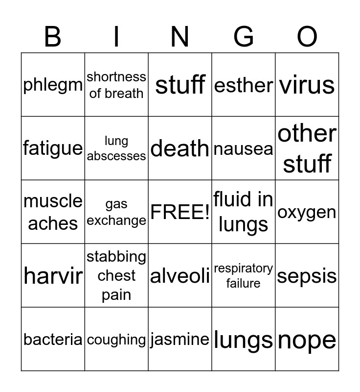 This bingo card has a free space and 24 words: stabbing chest pain, coughing, death, bacteria, virus, phlegm, fatigue, shortness of breath, fluid in lungs, alveoli, nausea, muscle aches, respiratory failure, sepsis, lung abscesses, lungs, oxygen, stuff, other stuff, gas exchange, nope, harvir, esther and jasmine.